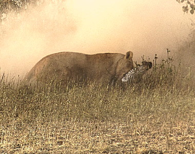 The lions start their approach at about 2:52 and a missed attack at 3:15, the kill at 3:38, the rest of the pride approaching at 4:07, and seven coming in to feed at 5:35.