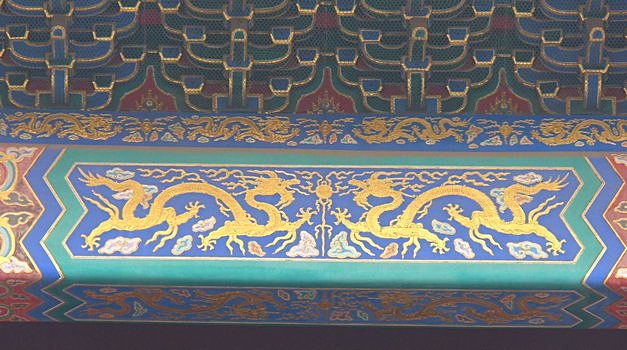 Dragon designs painted on the temple and on a marble relief between two stairways.